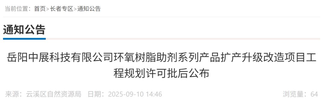 近日,云溪區(qū)自然資源局對岳陽中展科技有限公司"環(huán)氧樹脂助劑系列產(chǎn)品擴產(chǎn)升級改造項目"工程規(guī)劃許可進(jìn)行公布。